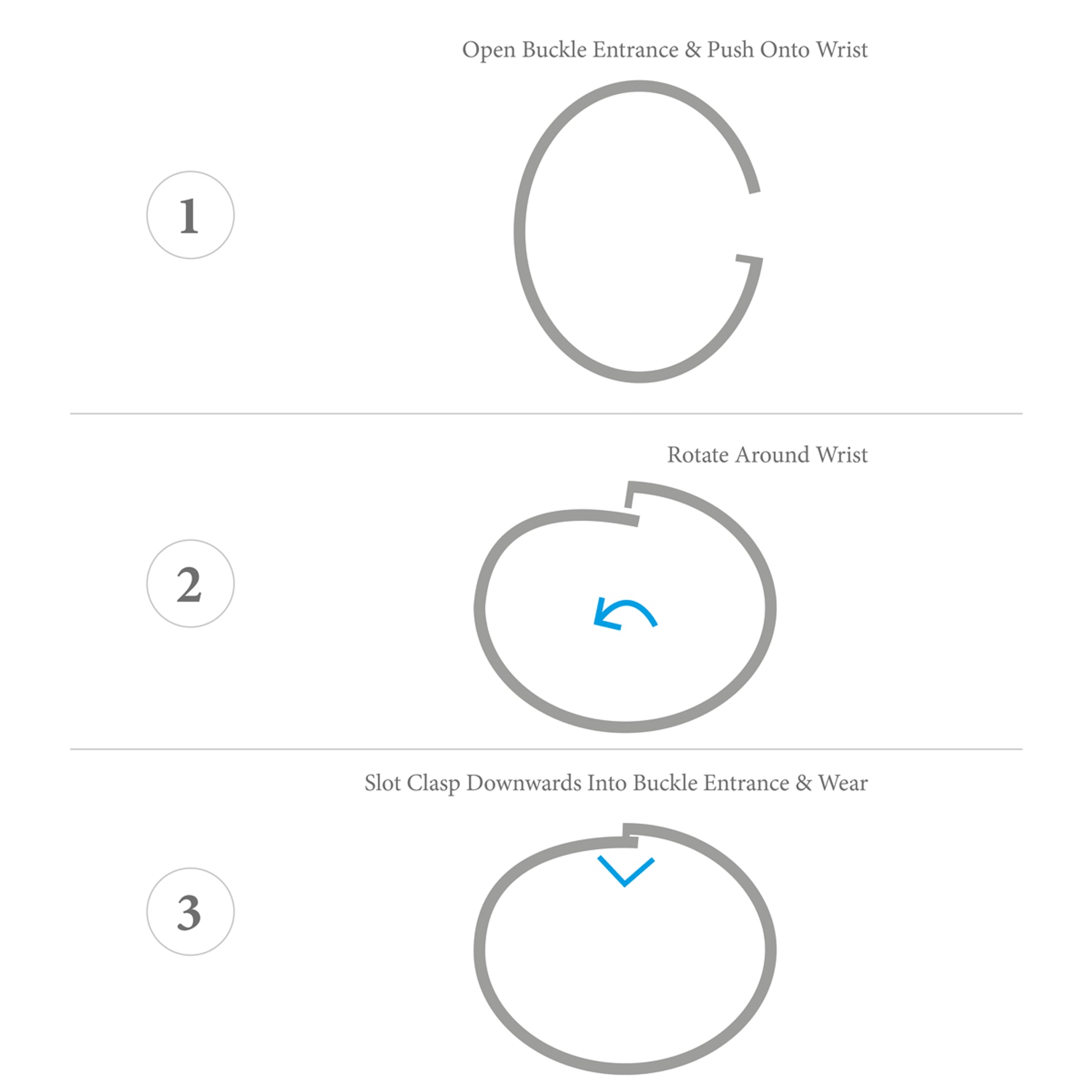 Ce bracelet est disponible en une seule taille : 55 mm entre les surfaces intérieures du poignet, soit environ 19 cm de tour de poignet. Pour le mettre ou le retirer, il suffit de dévisser le fermoir. La forme du bracelet peut être légèrement ajustée. Moins, c'est plus.