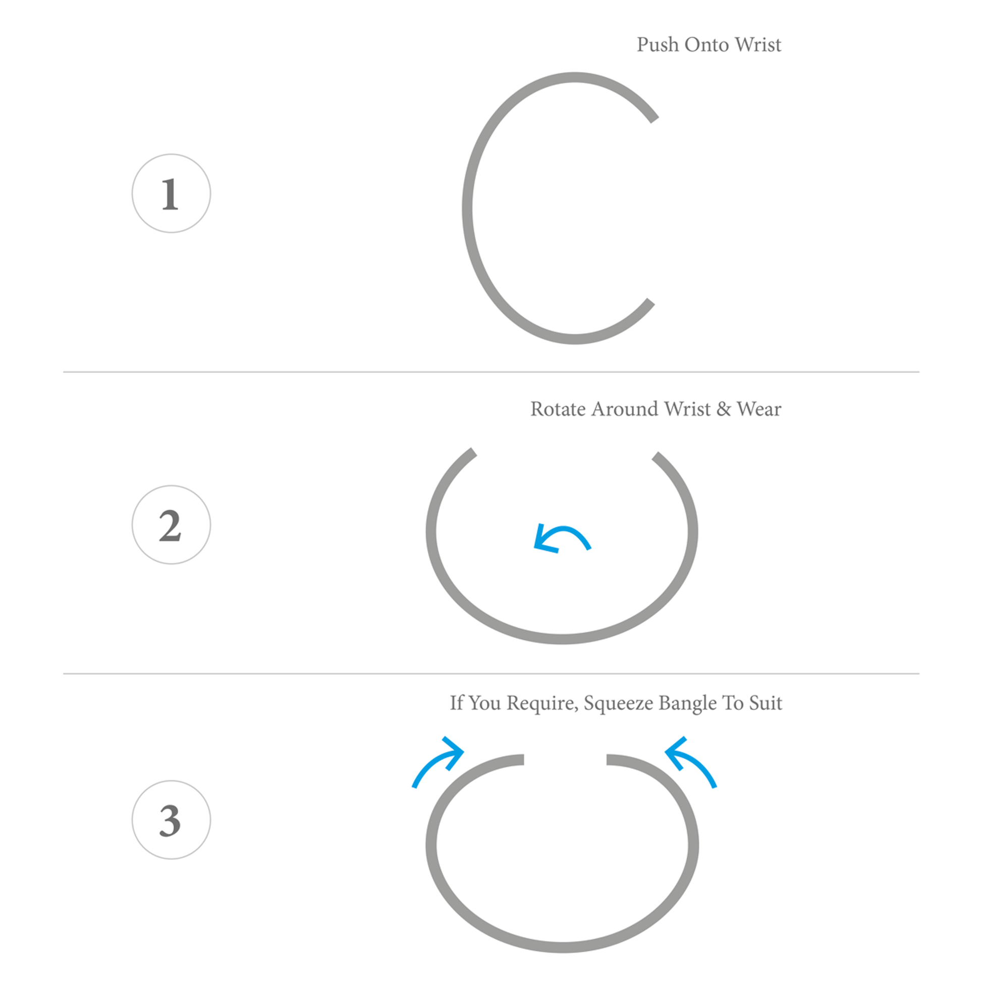 This bangle is available in four bangle lengths, 17cm, 19cm, 21cm or 23cm in circumference. The shape of the bangle can be lightly adjusted to suit. Less is More.
