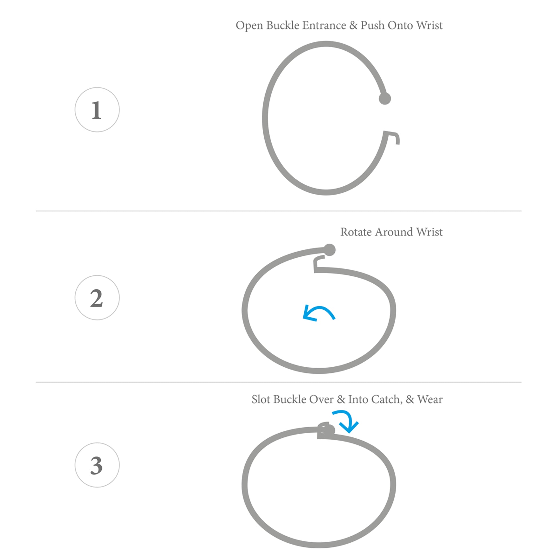 This bangle is available in one size only, 55mm between inside surfaces across the wrist which roughly equates to 19cm around the wrist. To take the bangle on or off your wrist, simply (un)hook the buckle from the catch. The shape of the bangle can be lightly adjusted to suit. Less is More.