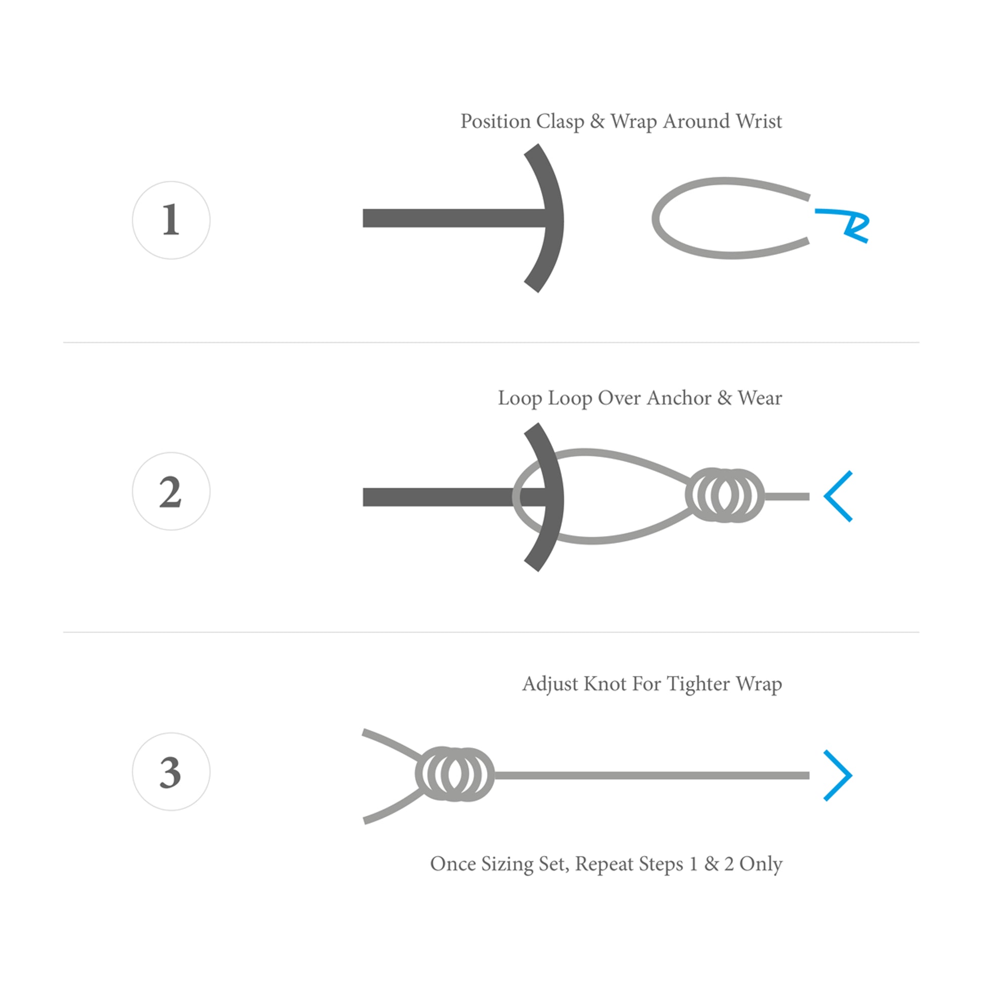 This bracelet is one size fits all, with the leather able to extend or tighten to suit your wrist size. To take the bracelet on or off your wrist, simply slide the one adjustable knot around the leather to make the loop size smaller or larger, and once set, keep the loop size consistent and continue wearing by easily unhooking the clasp from the loop. Less is More.