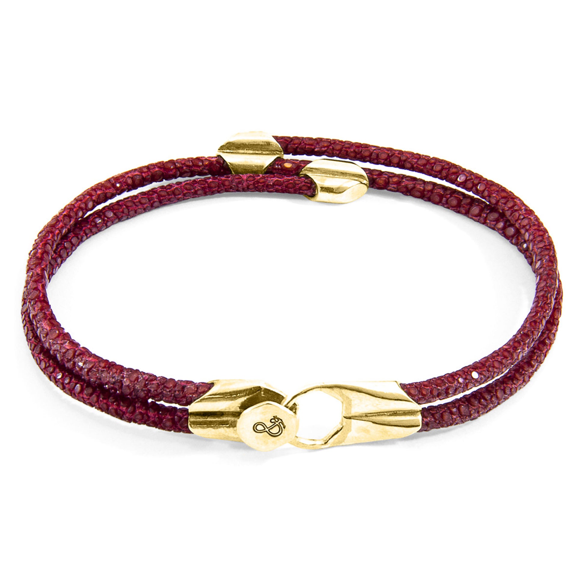 The Bordeaux Red Helios 9ct Yellow Gold and Stingray Leather Bracelet was both designed and skilfully handcrafted completely in Great Britain. Combining British craft manufacturing with a discerning modern-minimalist style, this bracelet features:
