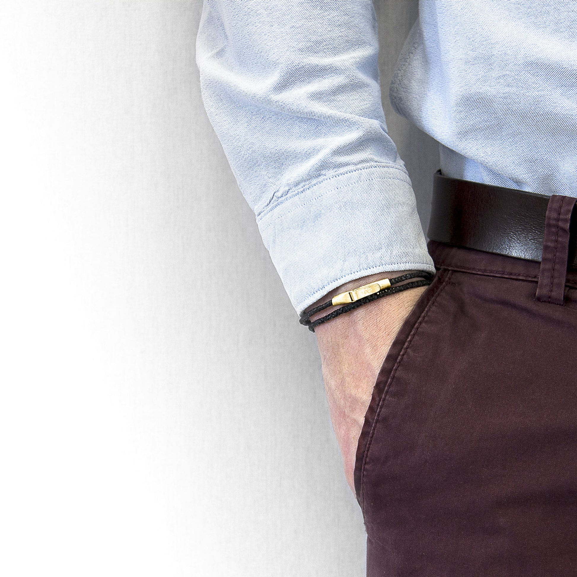 The Raven Black Regal 9ct Yellow Gold and Stingray Leather Bracelet was both designed and skilfully handcrafted completely in Great Britain. Combining British craft manufacturing with a discerning modern-minimalist style, this bracelet features: