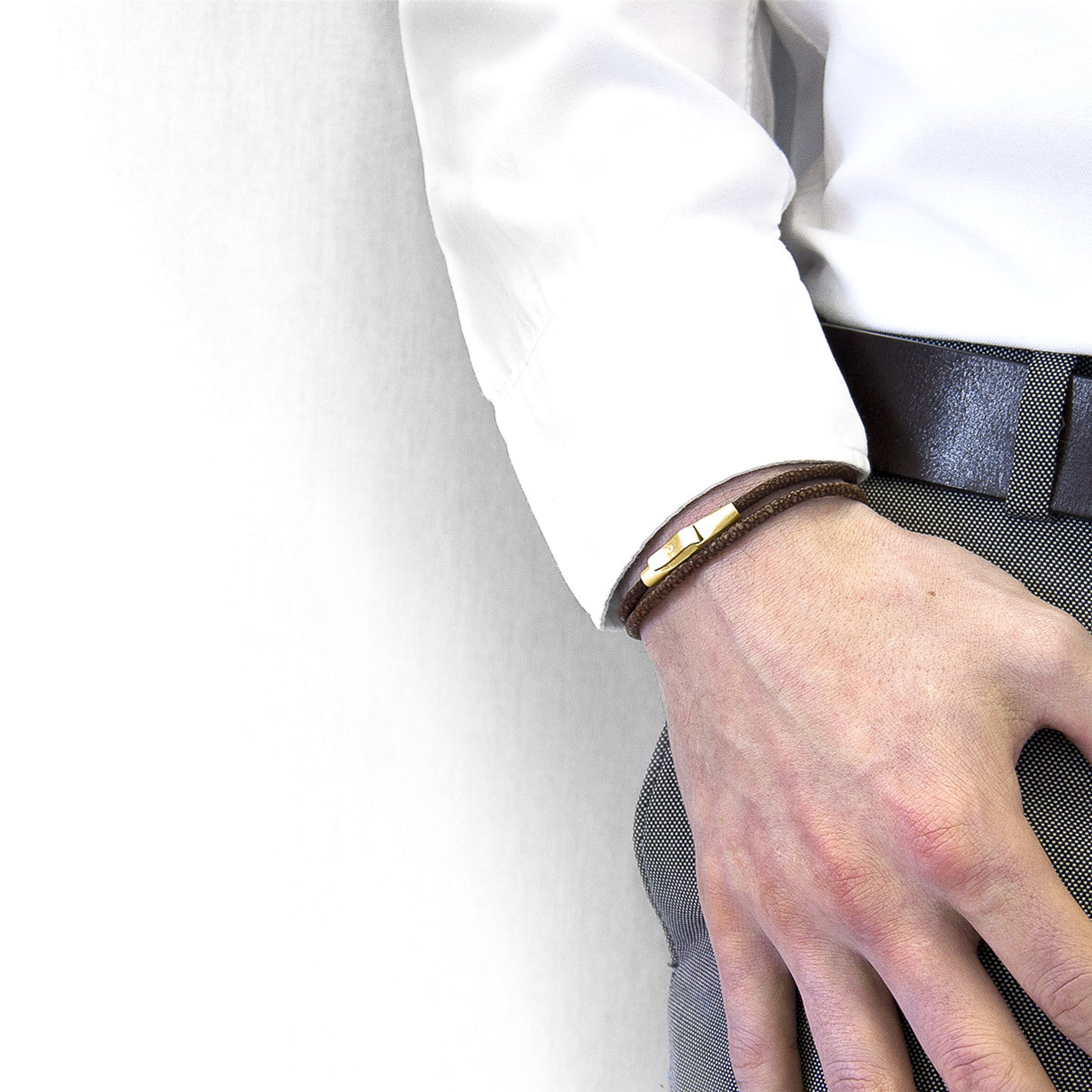 The Mocha Brown Regal 9ct Yellow Gold and Stingray Leather Bracelet was both designed and skilfully handcrafted completely in Great Britain. Combining British craft manufacturing with a discerning modern-minimalist style, this bracelet features: