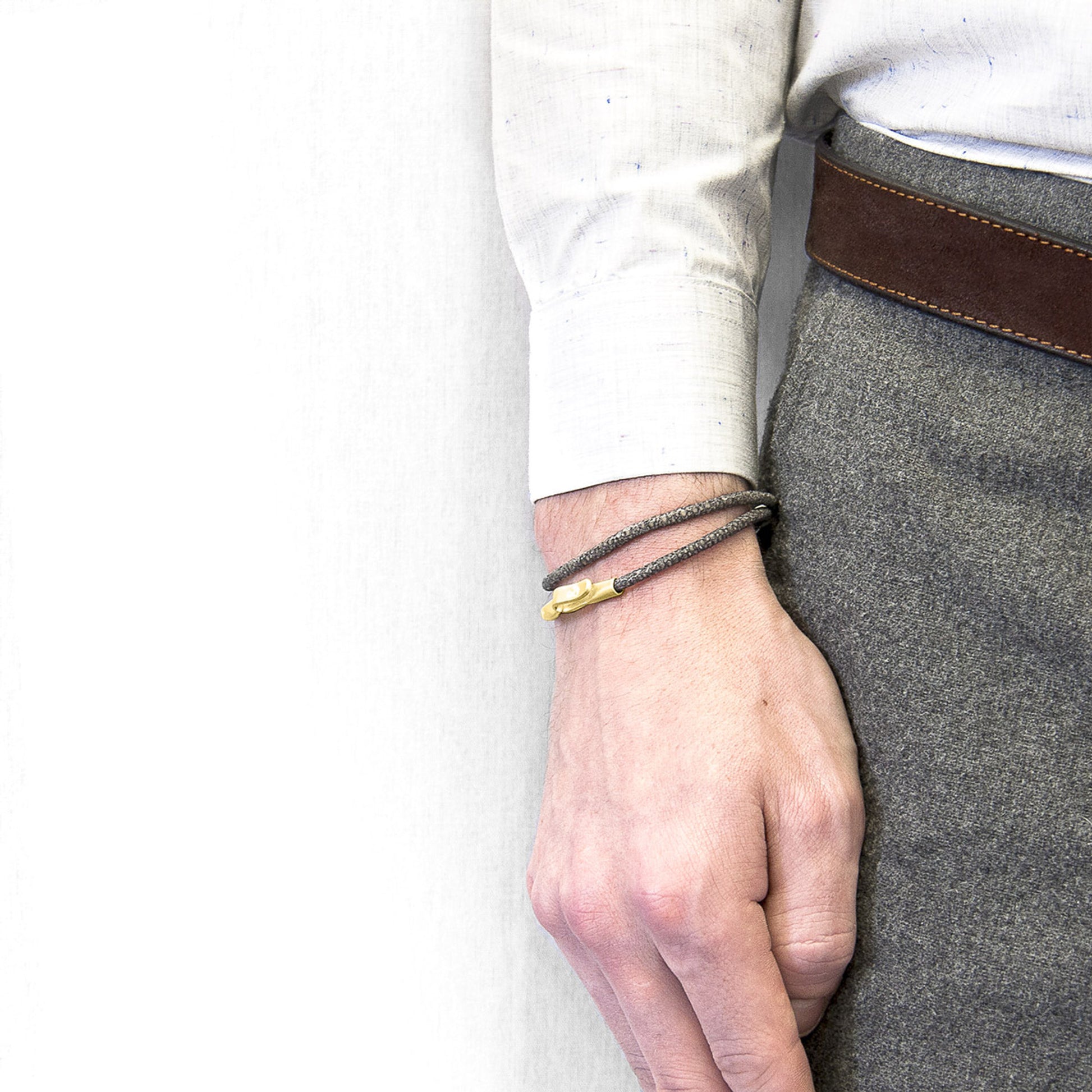 The Shadow Grey Regal 9ct Yellow Gold and Stingray Leather Bracelet was both designed and skilfully handcrafted completely in Great Britain. Combining British craft manufacturing with a discerning modern-minimalist style, this bracelet features:
