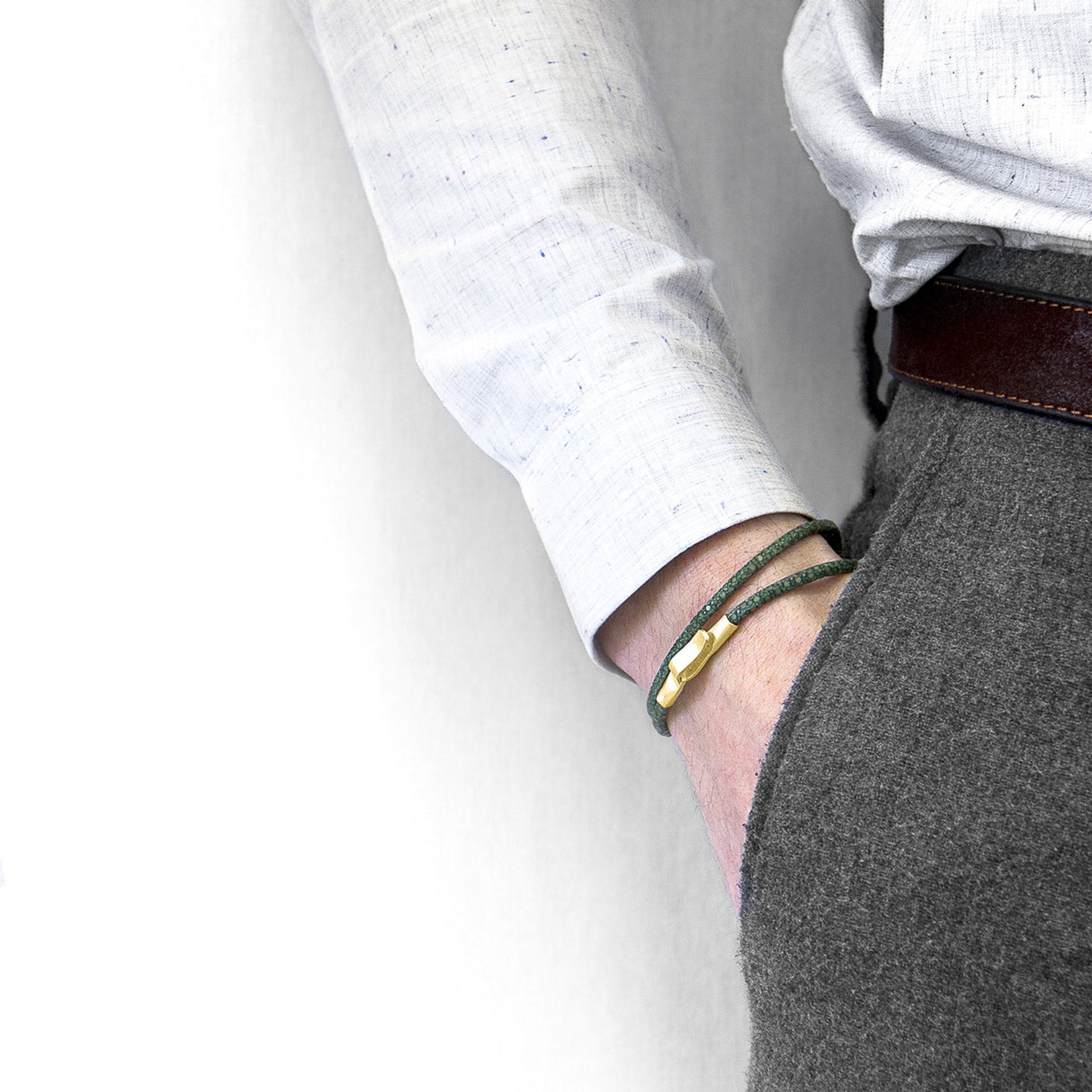 The Racing Green Regal 9ct Yellow Gold and Stingray Leather Bracelet was both designed and skilfully handcrafted completely in Great Britain. Combining British craft manufacturing with a discerning modern-minimalist style, this bracelet features: