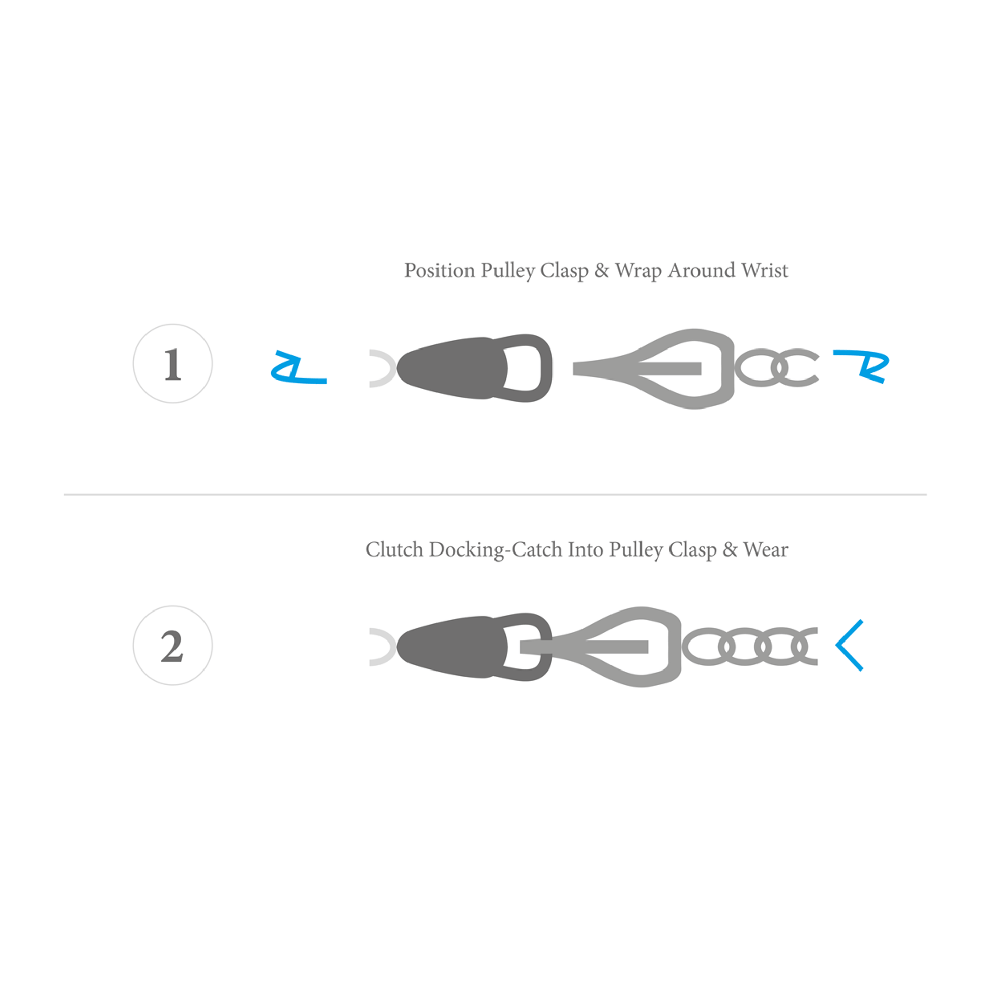 This bracelet is available in four bracelet lengths, 17cm, 19cm, 21cm or 23cm in circumference. To take the bracelet on or off your wrist, simply (un)clutch the docking-catch from the divider pulley. Less is More