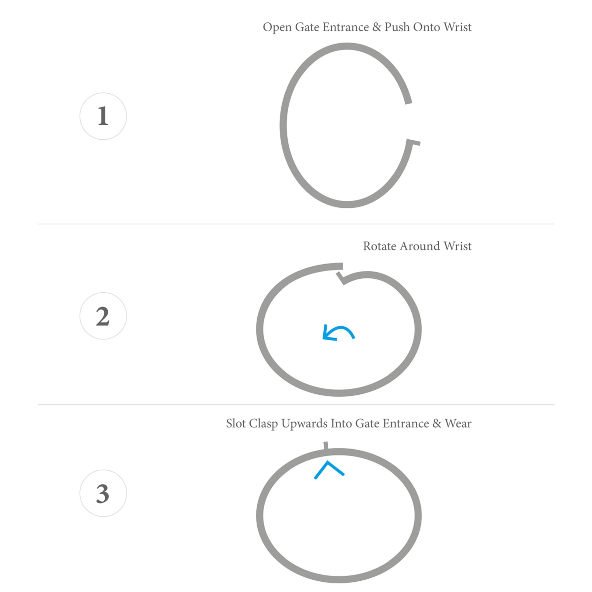 This bangle is available in one size only, 65mm between inside surfaces across the wrist which roughly equates to 21cm around the wrist. To take the bangle on or off your wrist, simply (un)slot the clasp from the gate. The shape of the bangle can be lightly adjusted to suit. Less is More.