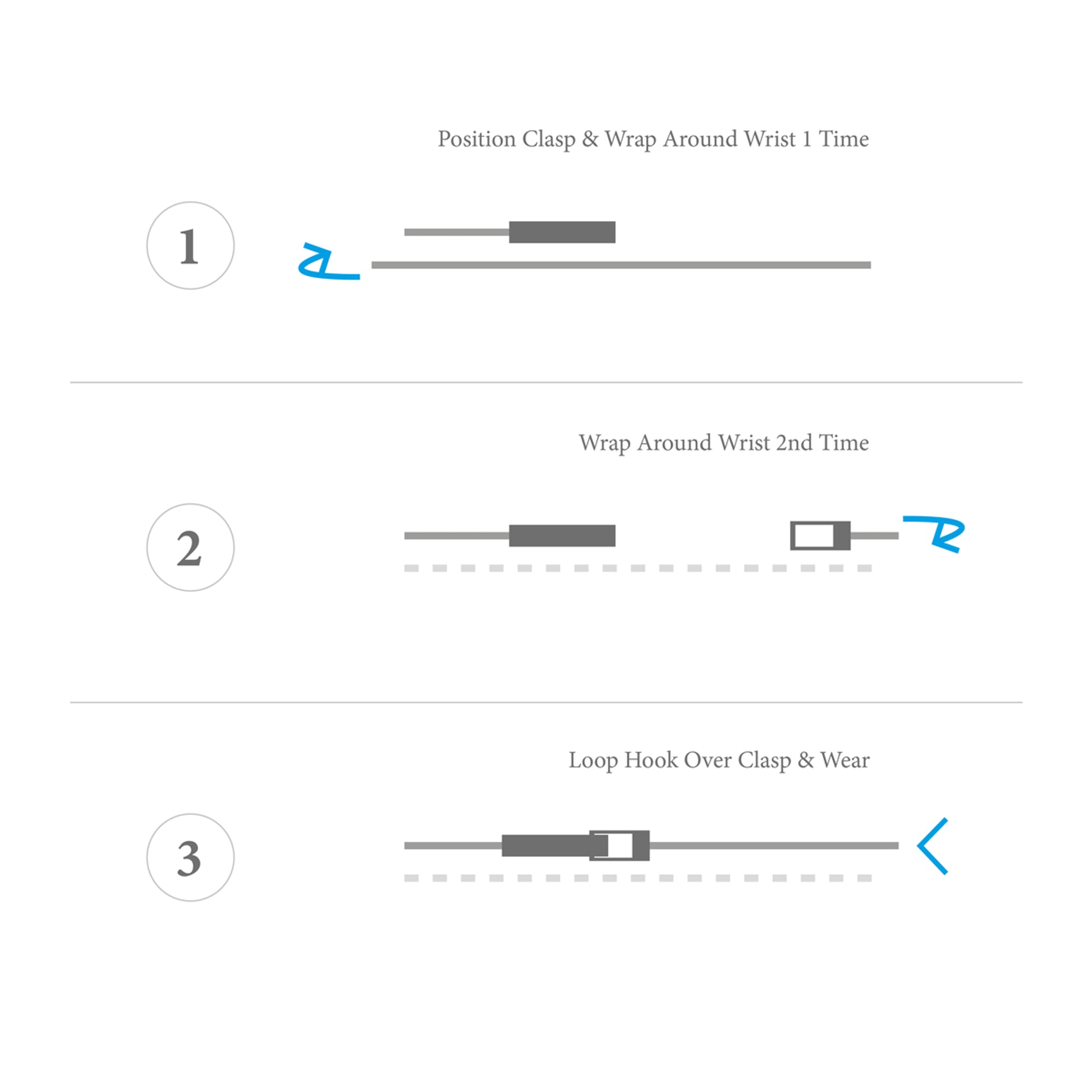 This double wrap bracelet is available in four bracelet lengths, 17cm, 19cm, 21cm or 23cm in circumference. To take the bracelet on or off your wrist, simply double wrap the bracelet, then slide the hook over the flat clasp and secure. Less is More.
