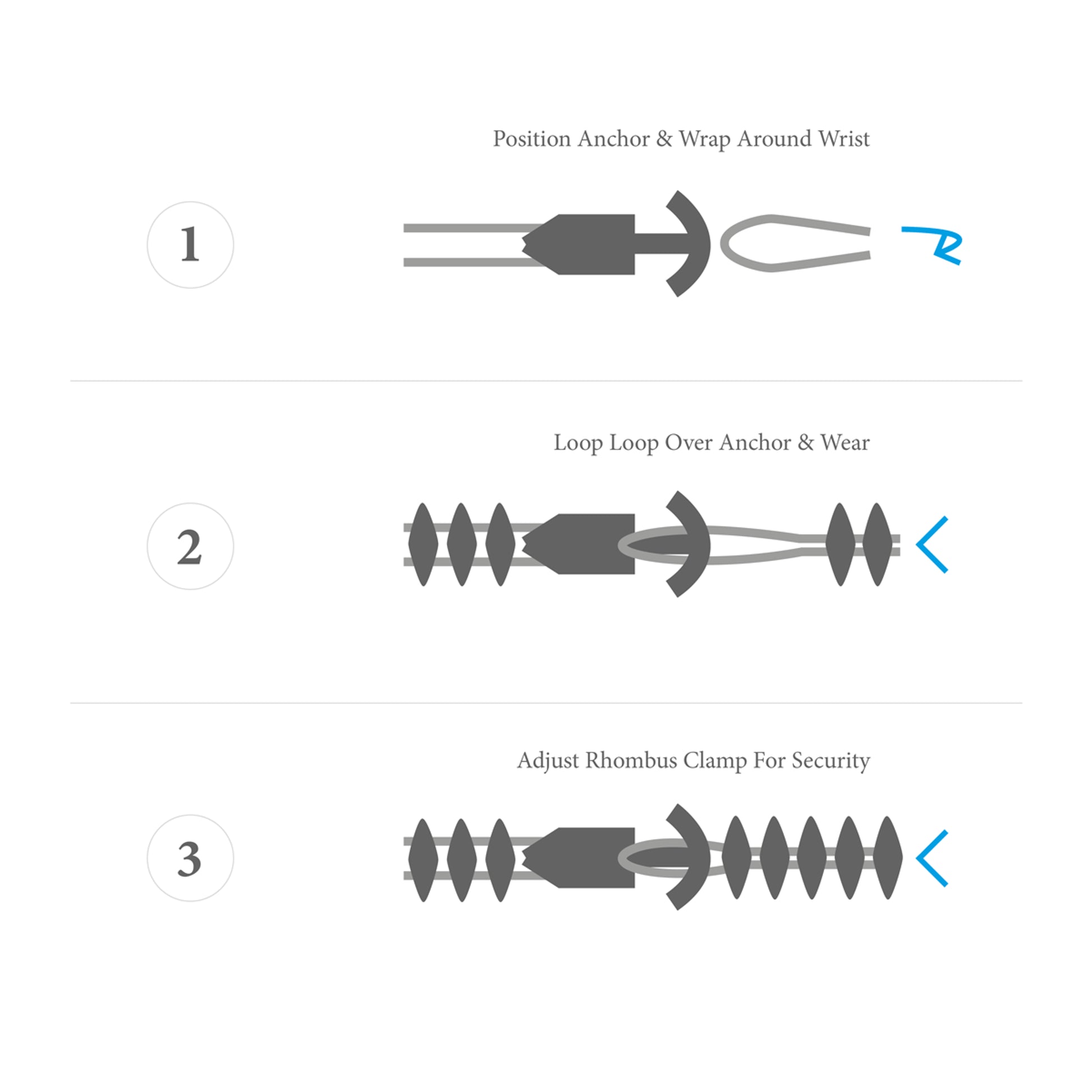 This bracelet is available in four bracelet lengths, 17cm, 19cm, 21cm or 23cm in circumference. To take the bracelet on or off your wrist, simply (un)hook the clasp from the loop and slide the final rhombus baton in the series to act as a clamp for added security. Less is More.